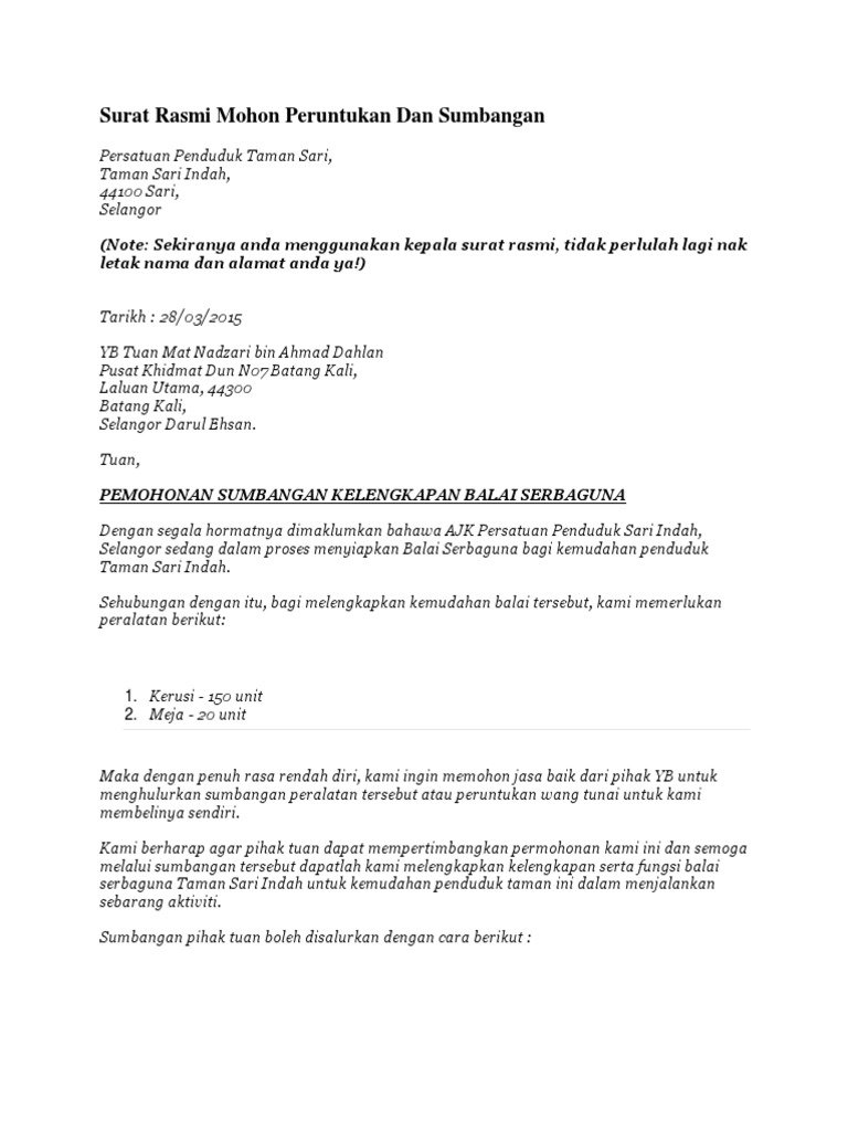 Contoh Surat Mohon Sumbangan Pembinaan Surau Contoh Surat from 3.bp.blogspot.com Surat permohonan dana merupakan salah satu contoh surat resmi yang berfungsi sebagai surat untuk meminta bantuan dana secara tertulis dari suatu instansi ataupun organisasi kepada orang banyak/ umum baik di dalam ruang lingkup tertentu atau masyarakat luas. Adapun kop surat resmi biasa ditemukan pada. Surat permohonan adalah salah satu surat resmi yang berisi permintaan tentang suatu hal kepada pihak lain. Agar permohonan tersebut dikabulkan maka kita. Salah satu faktor yang biasanya sering menjadi kendala adalah masalah yang berkaitan dengan finansial atau. Surat permohonan sendiri dapat bersifat resmi atau pun tidak resmi. Adapun permohonan yang disampaikan dalam surat ini sangat beragam. Surat permohonan adalah surat yang berisi permohonan kepada sesorang, organisasi, atau instansi/perusahaan.