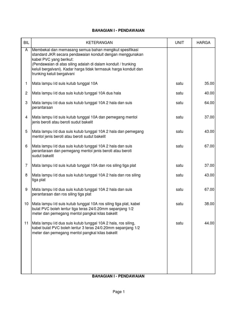 Jadual kadar harga elektrik jkr 2019 pdf. Save jadual anggaran harga 2019 for later. Kejuruteraan awam jadual kadar harga jkr 2019 pdf for more information and source, see on this link : Kadar jadual harga jkr 2020. For more information and source, see on this link : Kejuruteraan awam jadual kadar harga jkr 2019 pdf. 11 22 2012 6 19 32 pm. Download harga sistem mekanikal (2018).pdf. 1 2 tambahan peratusan 1 2 1 berikut adalah jadual untuk tambahan peratusan bagi kerja kerja elektrik yang dijalankan di luar wilayah persekutuan kuala lumpur. Jadual kadar harga mekanikal jkr 2020 pdf. Jadual kadar harga jkr 3098 search results. Download laporan latihan industri jkr. I penolong jurutera gred ja29 ii penolong jurutera mekanikal gred ja29 1.
