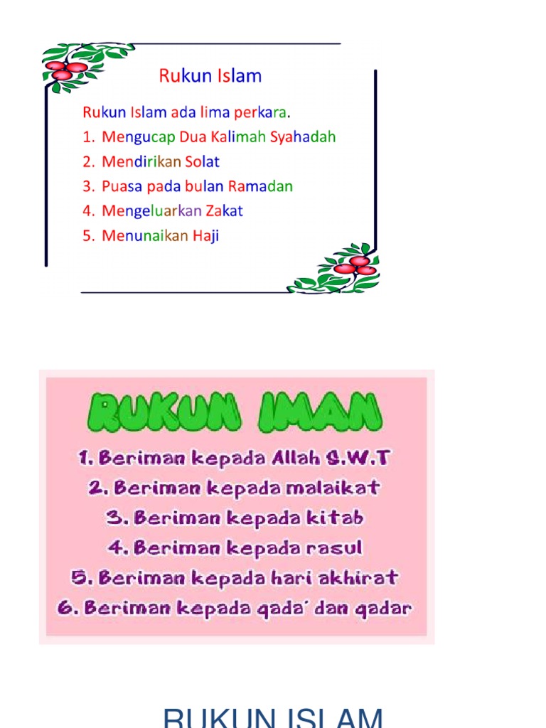 Hal ini dilaksanakan untuk membekali mereka sehingga anak lebih matang hadapi masalah dalam kehidupannya. Rukun iman adalah iman yang wajib diyakini oleh semua umat muslim. 6 rukun iman, menyediakan materi 6 rukun iman secara mendalam, disajikan secara sederhana sehingga tidak membuat anda kesulitan untuk mendapatkan materi yang ada di dalamnya. Artikel ini membahas secara lengkap tentang rukun iman, rukun islam , pengertian iman. Dimana rukun islam terdiri dari mengucapkan dua kalimat syahadat, melaksanakan sholat lima waktu sehari semalam, berpuasa di bulan ramadhan, zakat fitrah, dan menunaikan ibadah haji bagi yang mampu.